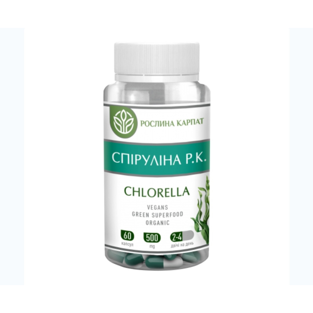 Морські водорості — Спіруліна Р.К. Chlorella Кількість у пакованні: 60 кап